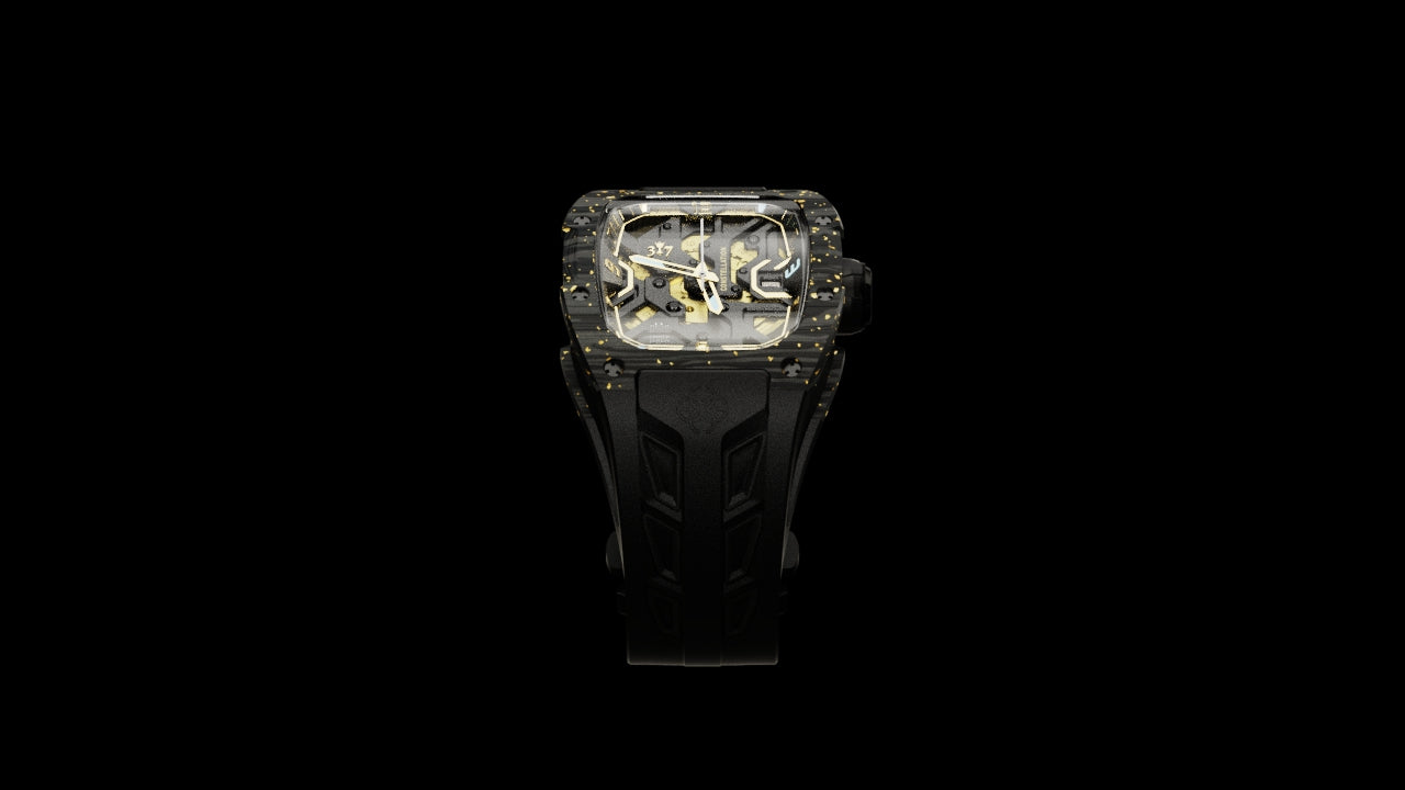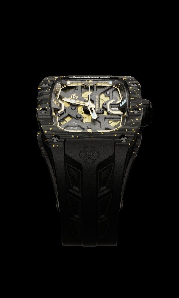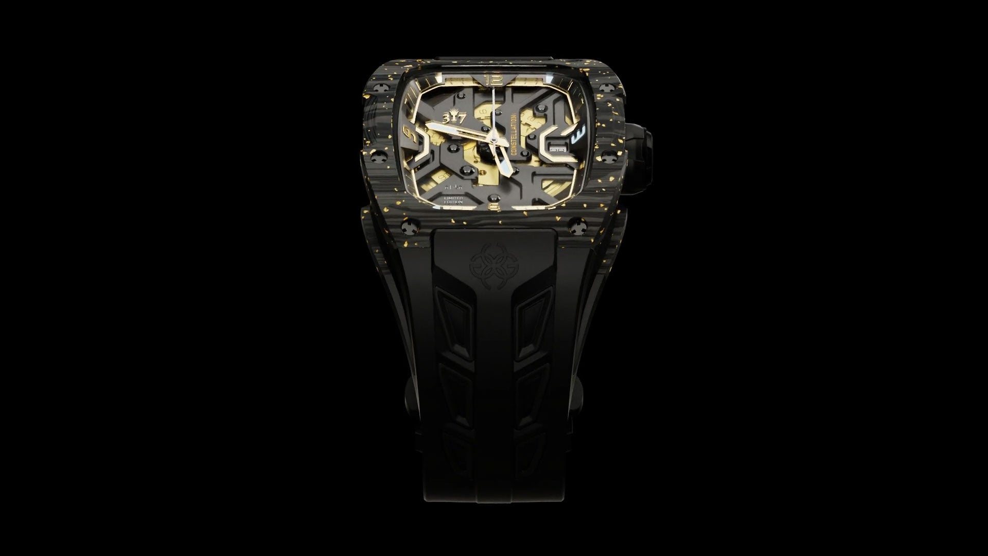 Carbon composite bezel and case back infused with gold flakes, paired with a high-grade titanium mid-case